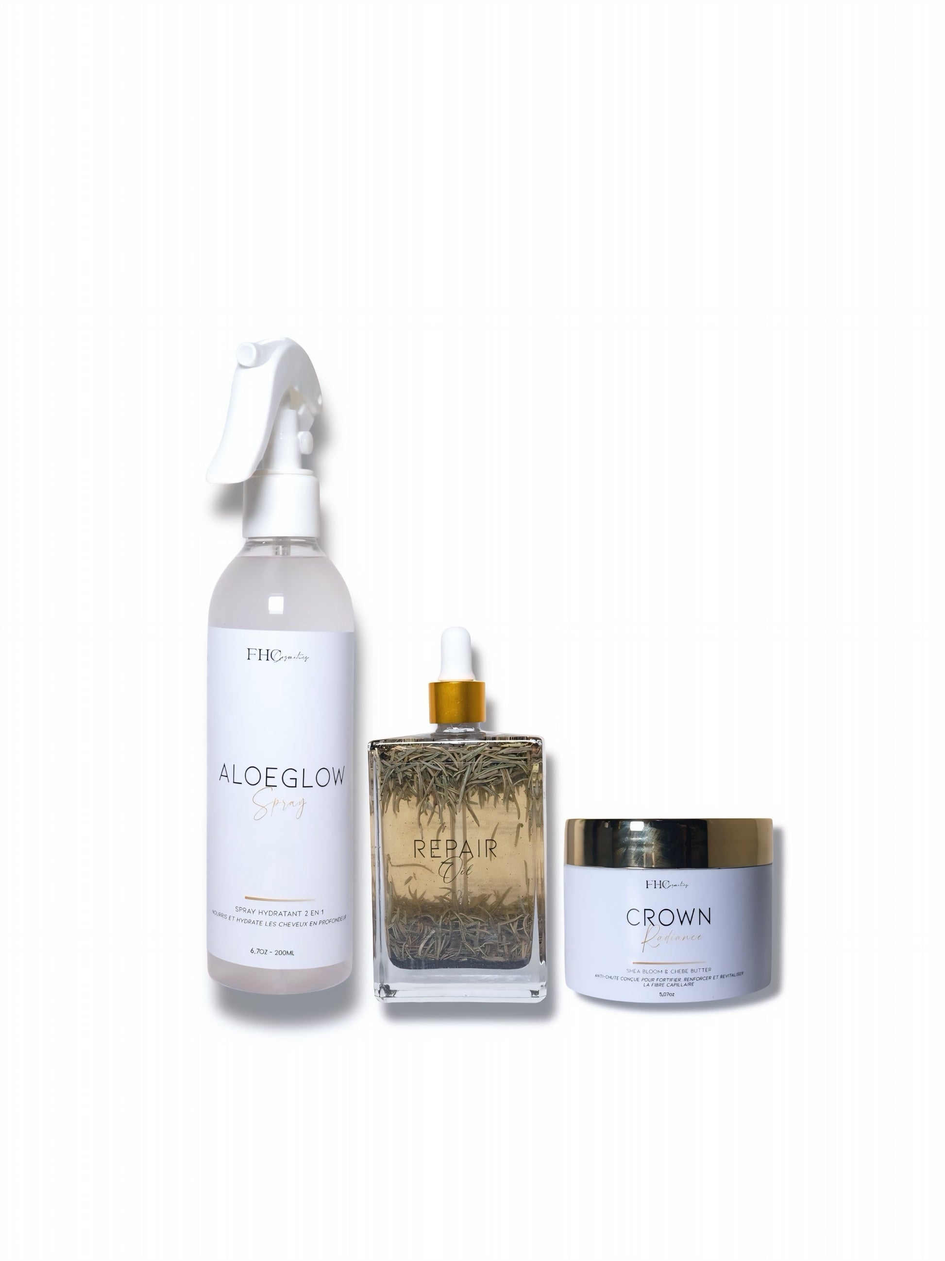 My Loc Routine est le trio parfait pour hydrater, nourrir et renforcer les cheveux afro/texturés selon la méthode L → O → C (Liquid, Oil, Cream). Chacun des trois produits joue un rôle complémentaire : le spray Aloe Glow hydrate en profondeur, l’huile Repair Oil apporte un soin ciblé sur le cuir chevelu et la pousse, et le baume Crown Radiance scelle l’hydratation tout en protégeant les longueurs. Ensemble, ils forment une routine capillaire hautement efficace pour des cheveux doux, brillants, souples et en pleine santé.
